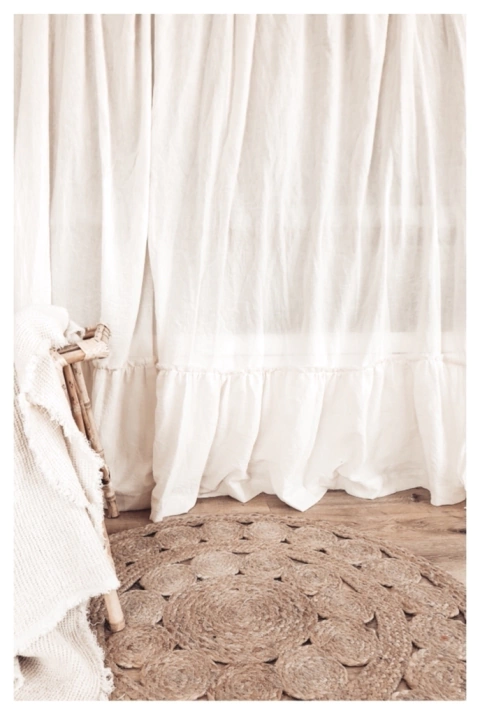 Cortina hecha en gasa, con terminacion de volados y tiritas para colgar. Tamaño: 1,90x1,90 Cómo colgarla: La cortina tiene 12 pares de tiritas que se atan directamente al barral. En el caso que tengas cortina plástica, pasar las tiritas por los agujeros de la cortina plástica, y luego la colgarla atánadola con nuditos directamente en el barral, de esta forma la cortina plástica queda escondida.